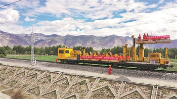 建设者在雪域高原“新天路”拉林铁路架设接触网导线。