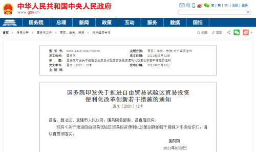 中工网讯 据中国政府网消息,近日,国务院印发《关于推进自由贸易试验区贸易投资便利化改革创新的若干措施》,就推进自贸试验区贸易投资便利化改革创新提出如下措施。