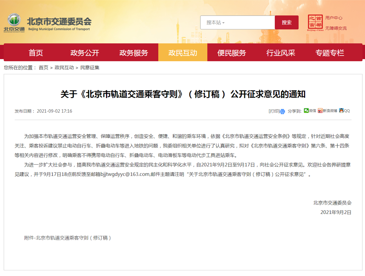 意见征求时间为2021年9月2日至9月17日18时,公众可将意见反馈至至邮箱bjjtwgdyyc@163.com,邮件主题请注明“关于北京市轨道交通乘客守则(修订稿)公开征求意见”。