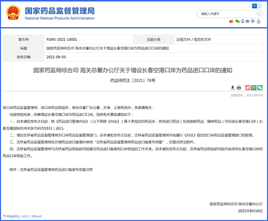 中工网讯 据国家药监局官网消息,近日,国家药监局发布增设长春空港口岸为药品进口口岸的通知(以下简称“通知”)。