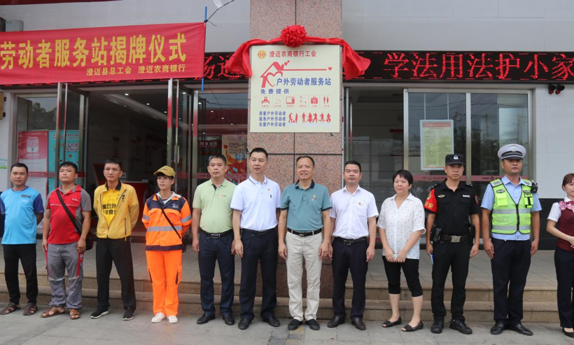 9月1日,海南省澄迈县总工会在澄迈农商银行江南支行举行“户外劳动者服务站”揭牌仪式。这是澄迈县总工会与澄迈农商银行、团县委、县车站联合在全县打造的第一期15家户外劳动者服务站。揭牌仪式上,澄迈县人大常委会副主任、县总工会主席潘思群与澄迈农商银行党委书记、董事长李通共同为服务站揭牌。