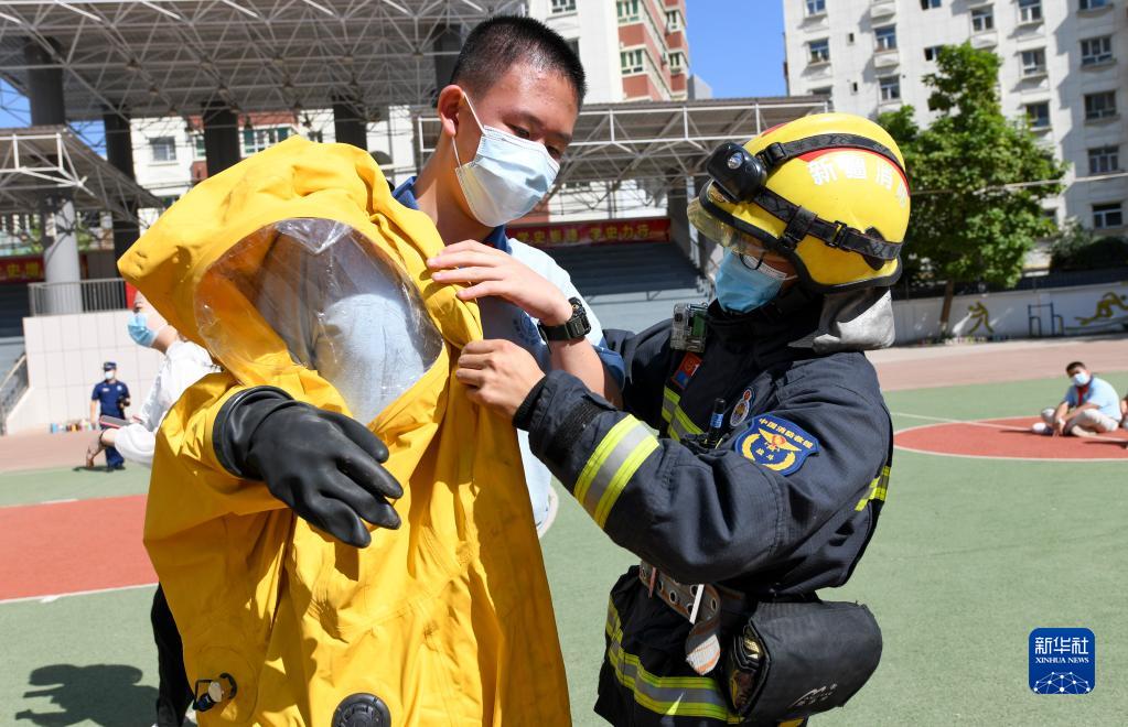 9月6日,在乌鲁木齐市第一中学,七年级9班学生谭明凯(左)在乌鲁木齐市消防救援支队消防员的指导下体验防化服。