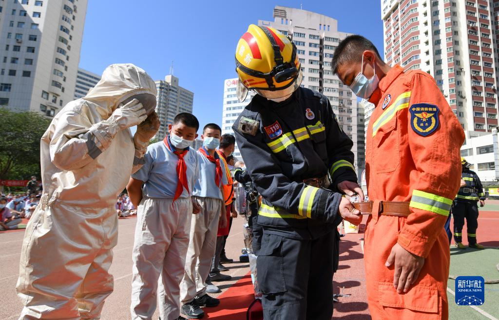 9月6日,在乌鲁木齐市第一中学,七年级9班学生刘泽锟(右一)在乌鲁木齐市消防救援支队消防员的指导下体验试穿救援服。