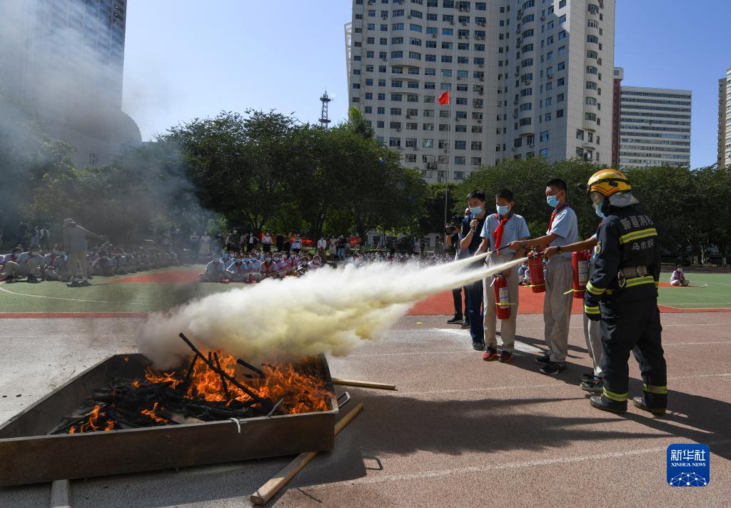 9月6日,在乌鲁木齐市第一中学,乌鲁木齐市消防救援支队的消防员在指导七年级学生使用灭火器灭火。
