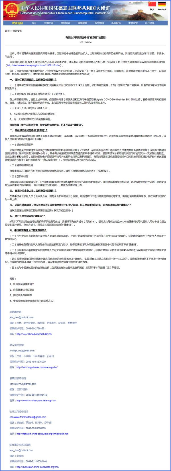 近日,申领“健康码”要求有所细化,针对乘客较为关心的问题,现答疑如下(注意:以往发布的通知、问题解答、注意事项中有与此文不一致处,以此文为准。如仍有不明确之处,请您关注所属领区内驻德使领馆网站或提前与该馆咨询):