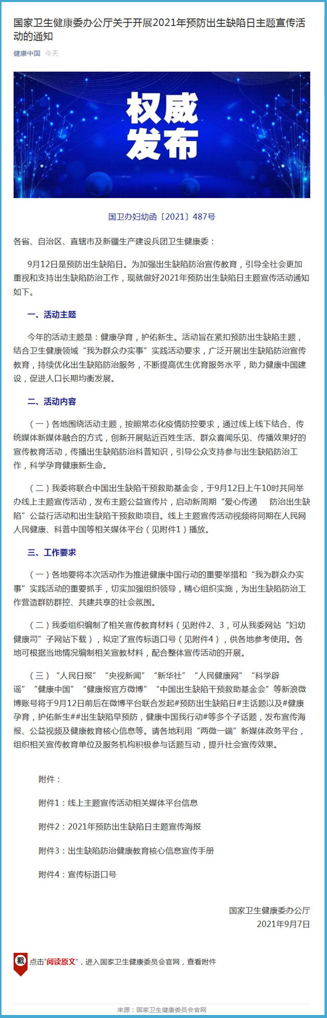 中工网讯 据健康中国微信公众号消息,9月12日是预防出生缺陷日,为加强出生缺陷防治宣传教育,引导全社会更加重视和支持出生缺陷防治工作,国家卫生健康委办公厅发布《关于开展2021年预防出生缺陷日主题宣传活动的通知》。