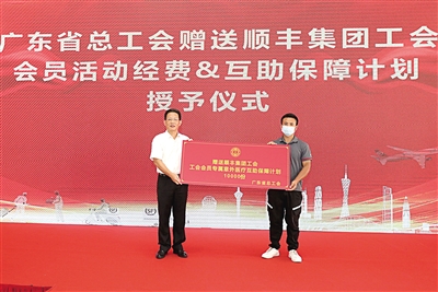 陈伟东(左)代表省总工会向顺丰集团广东区域工会会员代表赠送“广东省工会会员专属意外医疗互助保障计划”林景余/摄