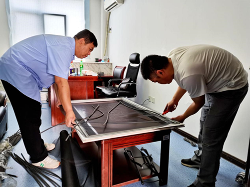 他们把旧纱网拆除,找来新纱网,将网纱与窗框对整齐,再用专门的固定工具将压条压紧。一天下来,两人汗流浃背,累得腰酸腿痛,共更换窗纱60余个,节约成本2000余元。 (方玉华)
