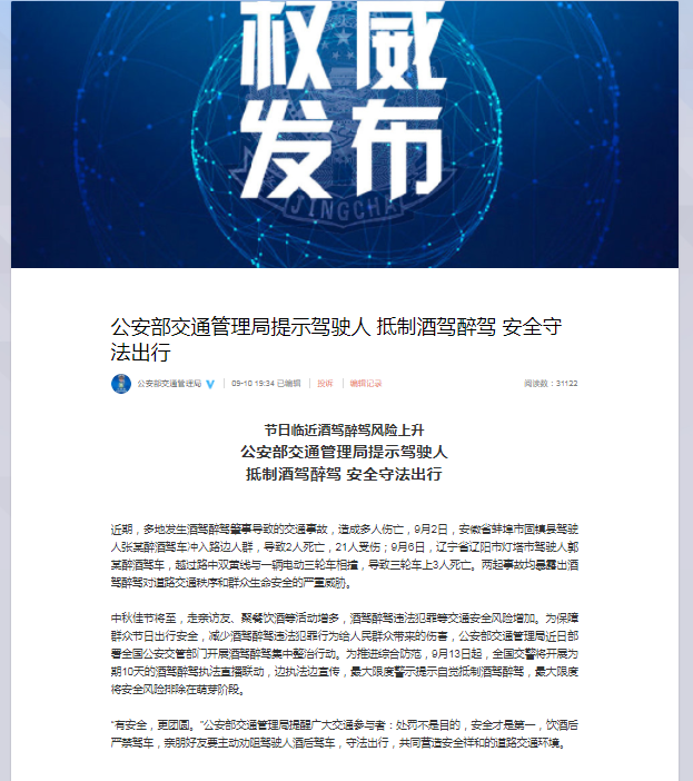 中工网讯 据公安部交通管理局官方微博消息,中秋佳节将至,走亲访友、聚餐饮酒等活动增多,酒驾醉驾违法犯罪等交通安全风险增加,为保障群众节日出行安全,减少酒驾醉驾违法犯罪行为给人民群众带来的伤害,公安部交通管理局近日部署全国公安交管部门开展酒驾醉驾集中整治行动。为推进综合防范,9月13日起,全国交警将开展为期10天的酒驾醉驾执法直播联动,边执法边宣传,最大限度警示提示自觉抵制酒驾醉驾,最大限度将安全风险排除在萌芽阶段。