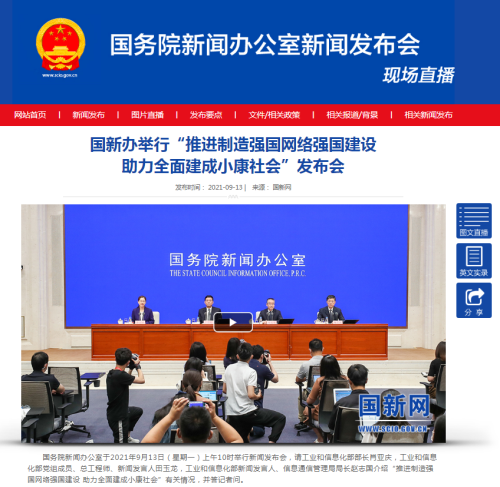 中工网讯 据国务院新闻办公室网站消息,国务院新闻办公室于9月13日上午10时举行新闻发布会,工业和信息化部部长肖亚庆,工业和信息化部党组成员、总工程师、新闻发言人田玉龙,工业和信息化部新闻发言人、信息通信管理局局长赵志国介绍了“推进制造强国网络强国建设 助力全面建成小康社会”有关情况,并答记者问。