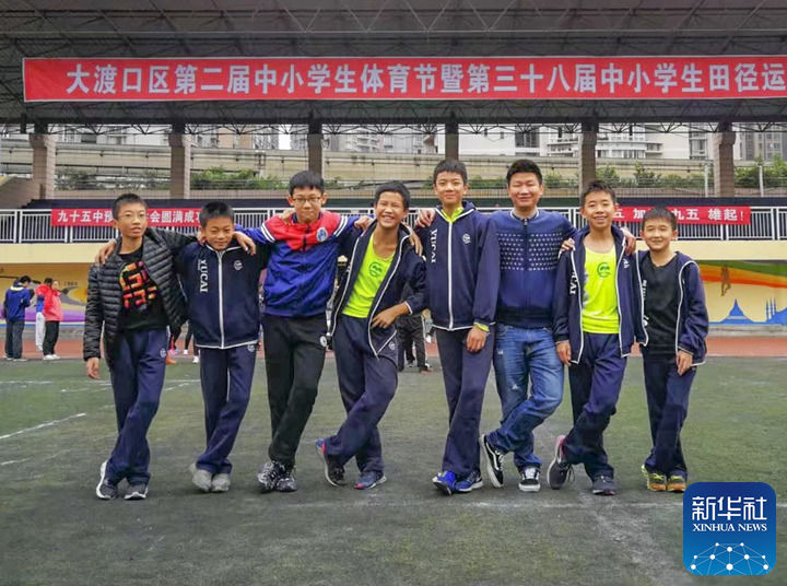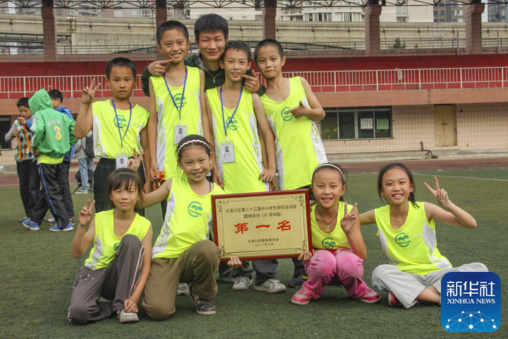 这是王红旭老师(右三)在重庆大渡口区中小学生田径运动会上和学生合影(2012年10月26日摄)。新华社发