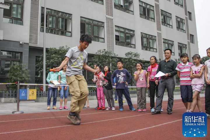 这是王红旭老师在重庆市大渡口区育才小学为学生示范跳绳(2014年5月15日摄)。新华社发