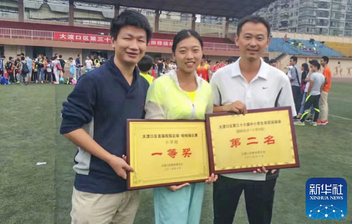 这是王红旭老师(左一)和同事在重庆大渡口区中小学生田径运动会上合影(2012年10月26日摄)。新华社发
