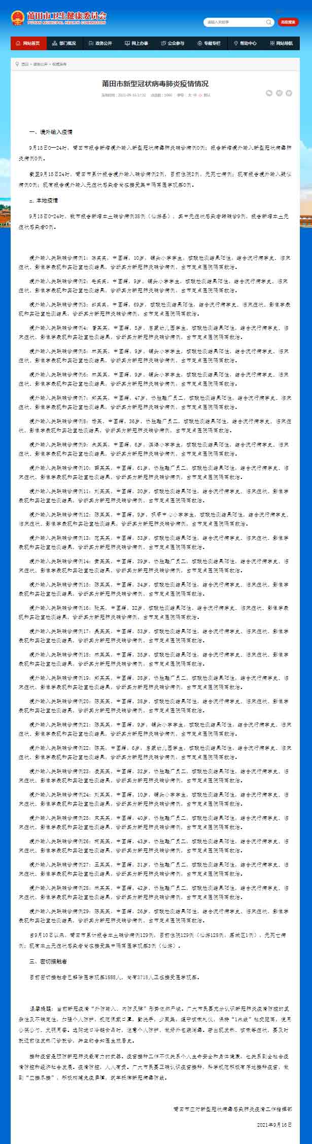 9月15日0-24时,我市报告新增本土确诊病例38例(仙游县),其中无症状感染者转确诊9例,报告新增本土无症状感染者0例。
