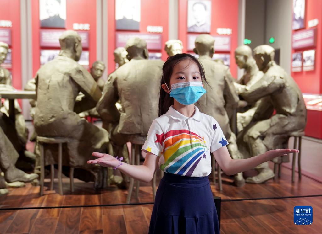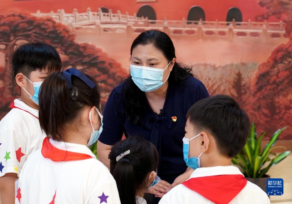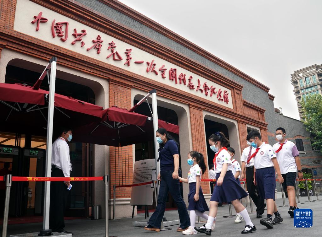 9月3日,上海市黄浦区卢湾一中心小学校长吴蓉瑾带着“红喇叭”小小讲解员等走进中共一大纪念馆。新华社记者 刘颖 摄