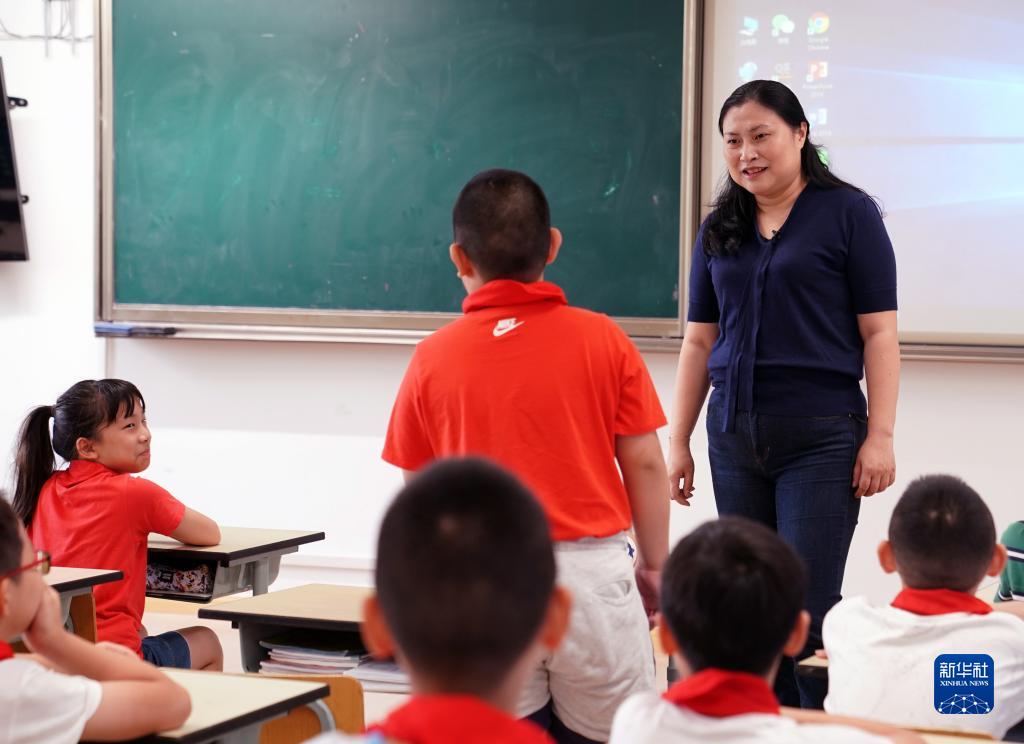 9月3日,上海市黄浦区卢湾一中心小学校长吴蓉瑾给学生上情感教育课。新华社记者 刘颖 摄