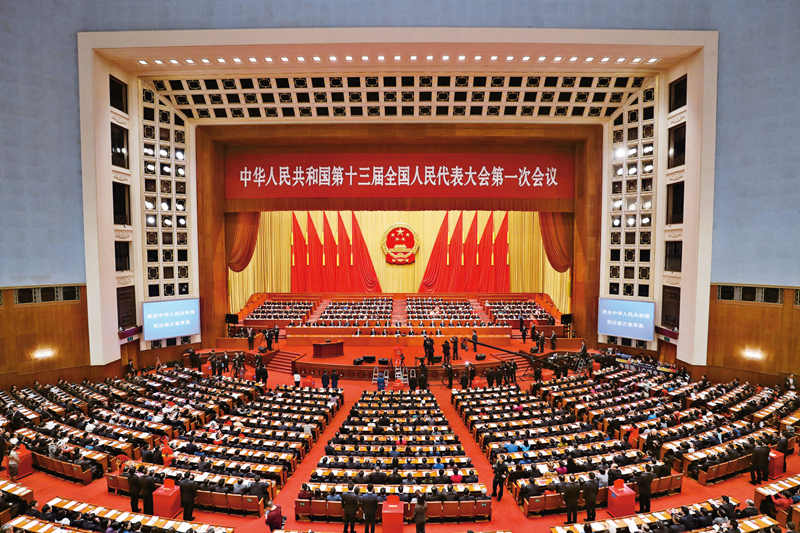 2018年3月11日,十三届全国人大一次会议在北京人民大会堂举行第三次全体会议,表决通过《中华人民共和国宪法修正案》。这次修改宪法,在宪法序言确定党的领导地位的基础上,将“中国共产党领导是中国特色社会主义最本质的特征”写入总纲。图为十三届全国人大一次会议第三次全体会议会场。 新华社记者 王晔/摄