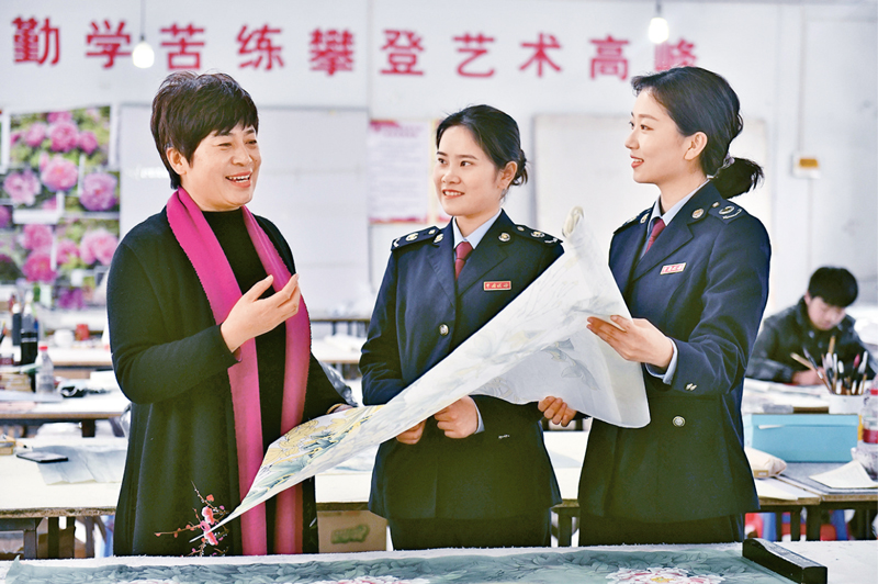 山东省菏泽市巨野县依托“菏泽牡丹”的资源优势,着力打造工笔牡丹画文化产业,巩固脱贫攻坚成果,有序推进乡村振兴。图为2021年3月20日,巨野县税务局“税收专家顾问团”成员上门走访,在鲁西书画院向院长徐凤秋(左)介绍针对工笔牡丹画产业的减税降费优惠政策。 新华社记者 郭绪雷/摄