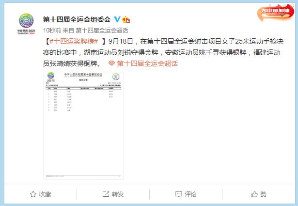 中工网讯 据第十四届全运会组委会官微消息,9月18日,在第十四届全运会射击项目女子25米运动手枪决赛的比赛中,湖南运动员刘锐夺得金牌,安徽运动员姚千寻获得银牌,福建运动员张靖婧获得铜牌。