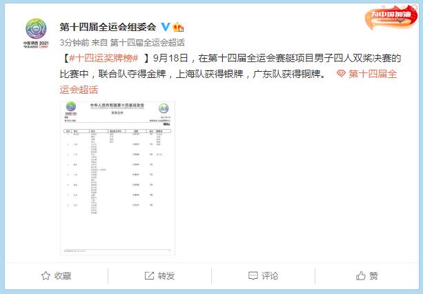 中工网讯 据第十四届全运会组委会官微消息,9月18日,在第十四届全运会赛艇项目男子四人双桨决赛的比赛中,联合队夺得金牌,上海队获得银牌,广东队获得铜牌。
