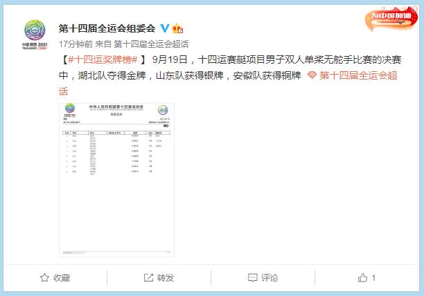 中工网讯 据第十四届全运会组委会官微消息,9月19日,十四运赛艇项目男子双人单桨无舵手比赛的决赛中,湖北队夺得金牌,山东队获得银牌,安徽队获得铜牌。