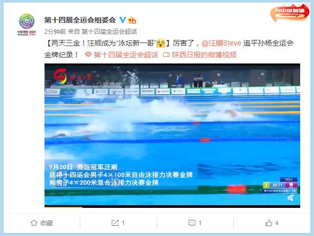 中工网讯 据第十四届全国运动会组织委员会官方微博消息,汪顺获得第十四届全运会男子400米混合泳比赛的冠军,实现该项目三连冠的伟业。