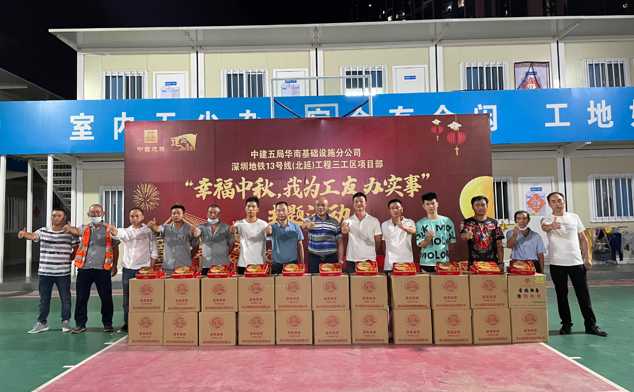 中秋佳节,深圳地铁13号线北延项目的200余名职工选择留守工地、奋战在现场一线,为了让工友们感受在异乡的中秋温暖,9月19日,中建五局华南公司基础设施分公司工会在深圳地铁13号线北延项目现场举办慰问活动。