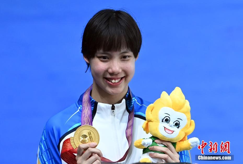 9月21日晚,第十四届全运会游泳项目女子100米仰泳决赛在西安举行,湖北选手彭旭玮以59秒31的成绩夺冠。图为彭旭玮在颁奖现场。 中新社记者 安源 摄