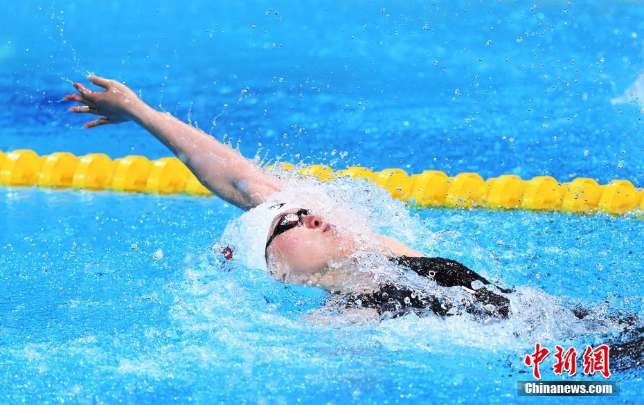 9月21日晚,第十四届全运会游泳项目女子100米仰泳决赛在西安举行,浙江选手傅园慧以59秒81的成绩,获得铜牌。图为傅园慧在比赛中。 中新社记者 安源 摄