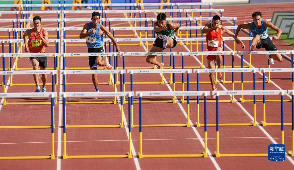 9月21日,江苏队选手孙启豪(左三)和浙江队选手华梓惠(左一)在十项全能110米栏比赛中。