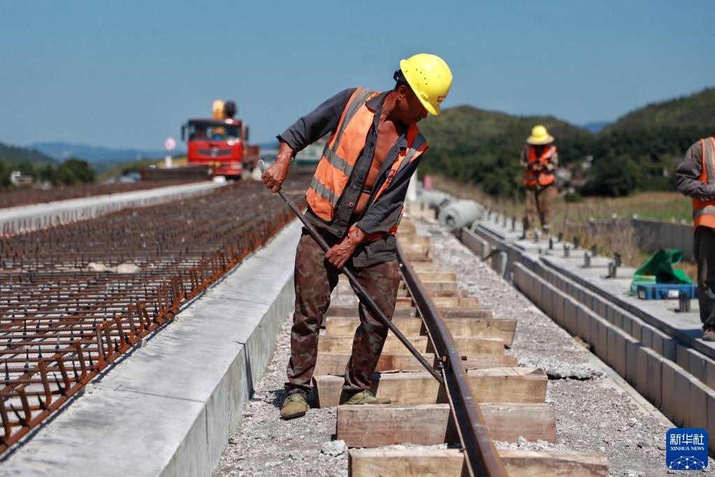 9月21日,工人在位于贵州省独山县的贵南高铁项目工地铺设轨道。