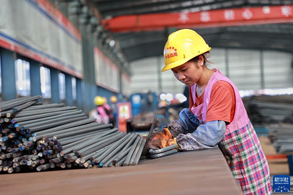 9月21日,一名工人在位于贵州省独山县的贵南高铁项目工地加工钢筋。