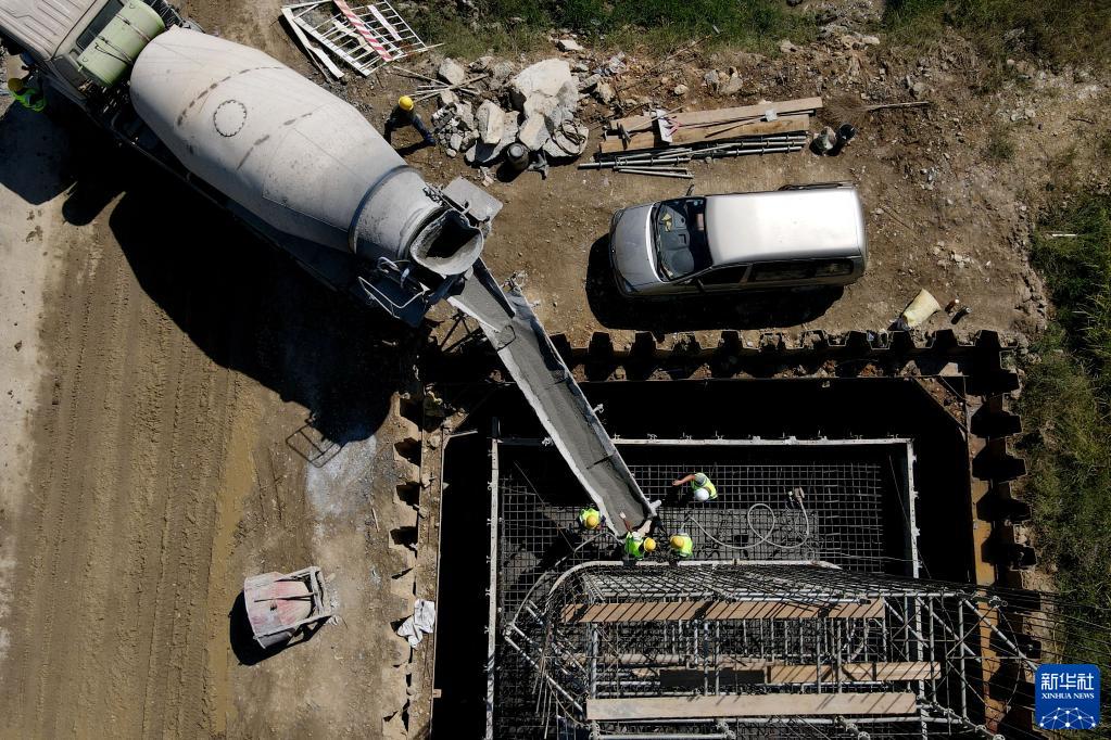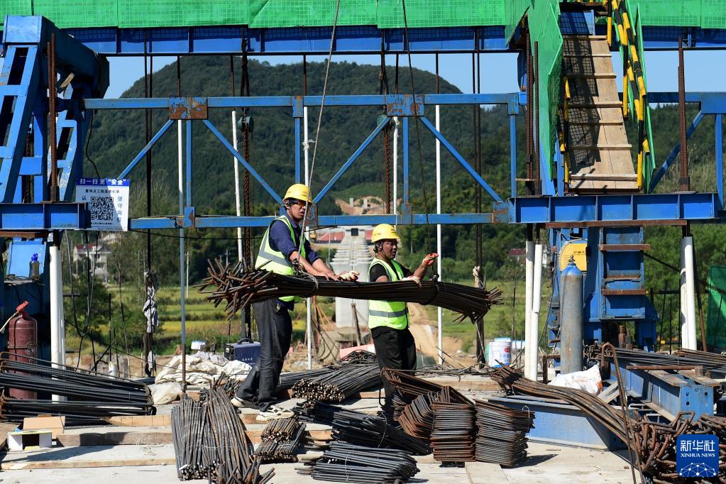 9月21日,工人在位于贵州省独山县的贵南高铁项目工地绑扎钢筋。