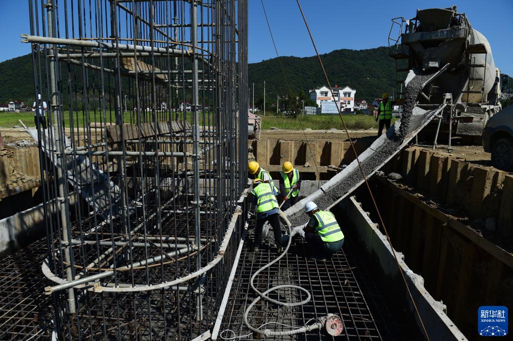 9月21日,施工人员在池黄铁路站前一标项目墩上特大桥工地作业。
