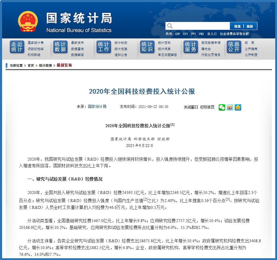 中工网讯 据国家统计局网站消息,日前,国家统计局、科学技术部和财政部联合发布了《2020年全国科技经费投入统计公报》。