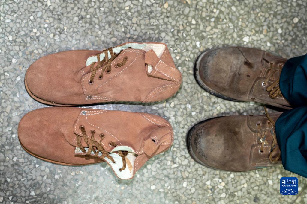 这是2021年2月27日拍摄的劳保鞋对比图:左为全新的鞋,右为柴闪闪穿旧的鞋。新华社记者 王翔 摄
