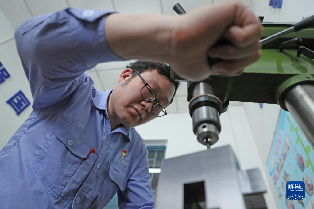 航空工业沈阳飞机工业(集团)有限公司首席技能专家方文墨在方文墨工作室打磨零件(2021年4月12日摄)。新华社记者 杨青 摄