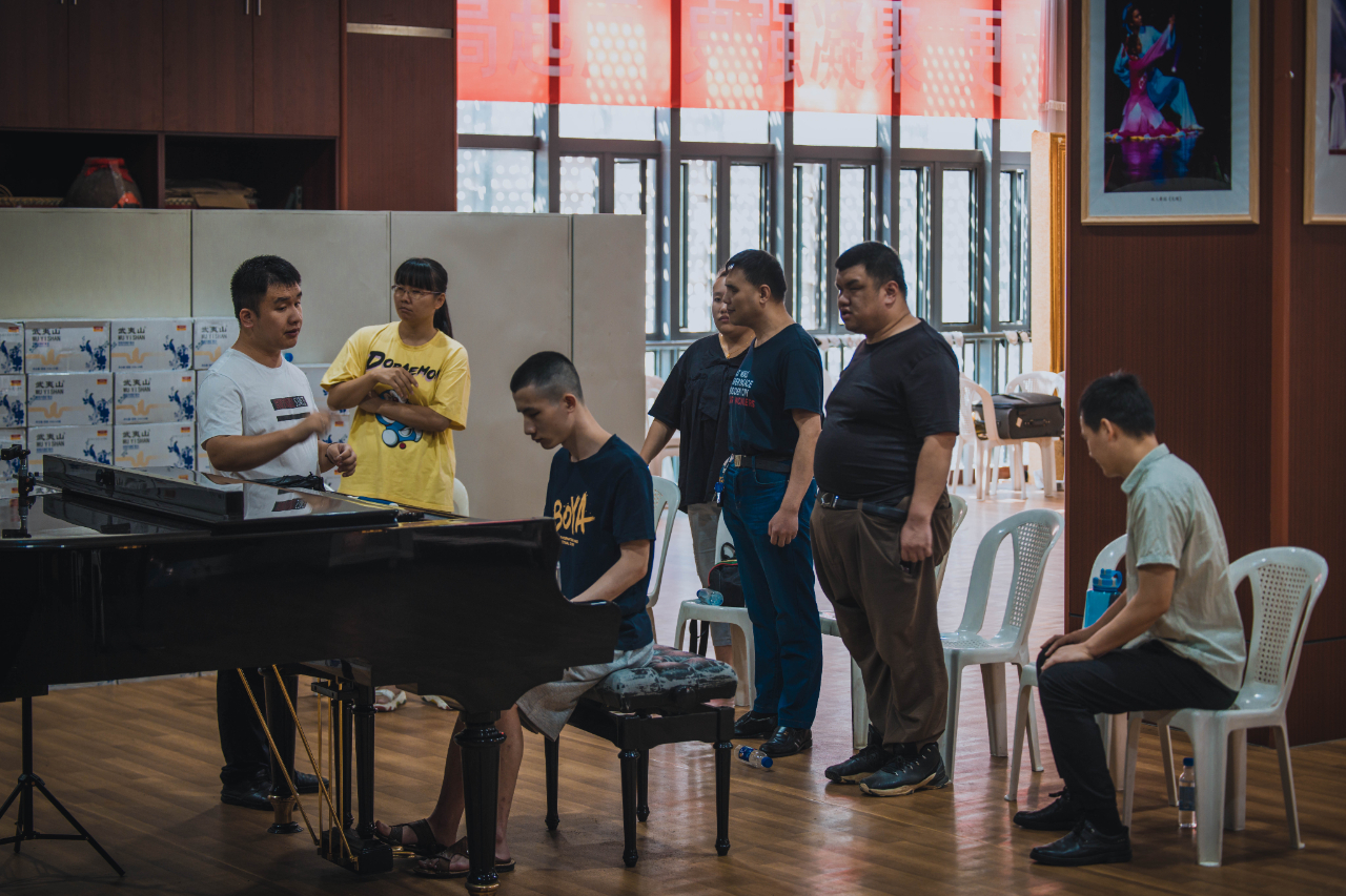 没有指挥、没有乐谱、没有提词器,视障人士进行无伴奏合唱,只能通过身边人的呼吸,来判断每一个乐句的始末和每一个气口的错落。在排练现场,黄延平一边通过敲击钢琴面板、踩踏地板等方式,为组合成员统一节拍;一边循着每个人的声音,反复修正大家在演唱中的音色、声调、咬字。