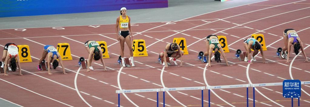 9月22日,福建队选手林雨薇(左四)在比赛前。林雨薇以12秒88的成绩获得冠军。