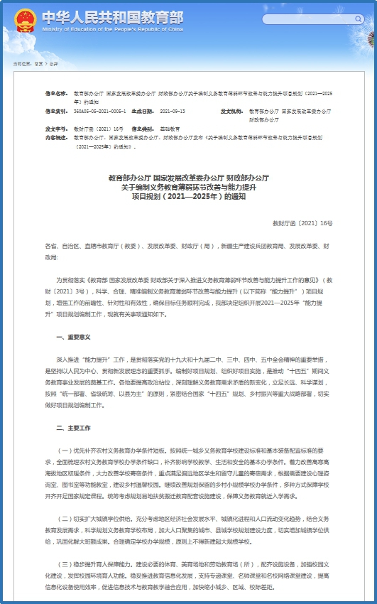 中工网讯 据教育部网站消息,为贯彻落实《教育部 国家发展改革委 财政部关于深入推进义务教育薄弱环节改善与能力提升工作的意见》(教财〔2021〕3号),科学、合理、精准编制义务教育薄弱环节改善与能力提升(以下简称“能力提升”)项目规划,增强工作的前瞻性、针对性和有效性,确保目标任务顺利完成,教育部决定组织开展2021—2025年“能力提升”项目规划编制工作,现就有关事项通知如下。
