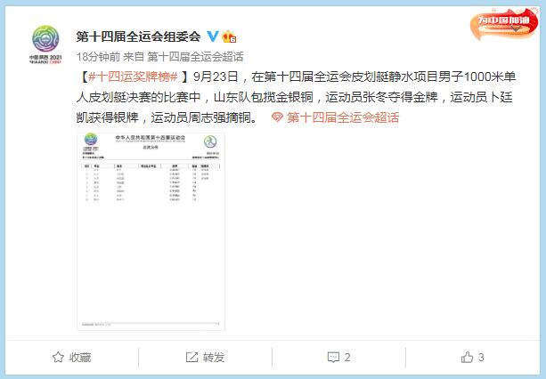 中工网讯 据第十四届全运会组委会官微消息,9月23日,在第十四届全运会皮划艇静水项目男子1000米单人皮划艇决赛的比赛中,山东队包揽金银铜,运动员张冬夺得金牌,运动员卜廷凯获得银牌,运动员周志强摘铜。