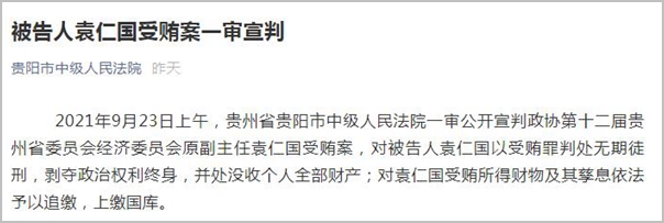 贵阳市中级人民法院微信公众号发消息称,2021年9月23日上午,贵州省贵阳市中级人民法院一审公开宣判政协第十二届贵州省委员会经济委员会原副主任袁仁国受贿案,对被告人袁仁国以受贿罪判处无期徒刑,剥夺政治权利终身,并处没收个人全部财产;对袁仁国受贿所得财物及其孳息依法予以追缴,上缴国库。