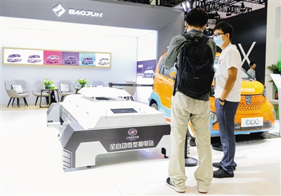 2021世界新能源汽车大会上,工作人员向参观者介绍全自动微型换电站。