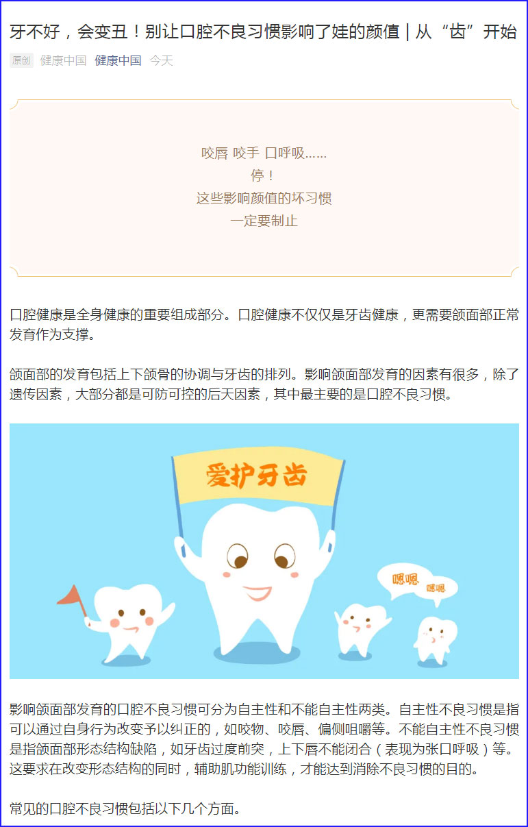 口腔健康是全身健康的重要组成部分。9月25日,健康中国微信公众号发文科普,口腔健康不仅仅是牙齿健康,更需要颌面部正常发育作为支撑。颌面部的发育包括上下颌骨的协调与牙齿的排列。影响颌面部发育的因素有很多,除了遗传因素,大部分都是可防可控的后天因素,其中最主要的是口腔不良习惯。影响颌面部发育的口腔不良习惯可分为自主性和不能自主性两类。自主性不良习惯是指可以通过自身行为改变予以纠正的,如咬物、咬唇、偏侧咀嚼等。不能自主性不良习惯是指颌面部形态结构缺陷,如牙齿过度前突,上下唇不能闭合(表现为张口呼吸)等。这要求在改变形态结构的同时,辅助肌功能训练,才能达到消除不良习惯的目的。常见的口腔不良习惯包括以下几个方面。