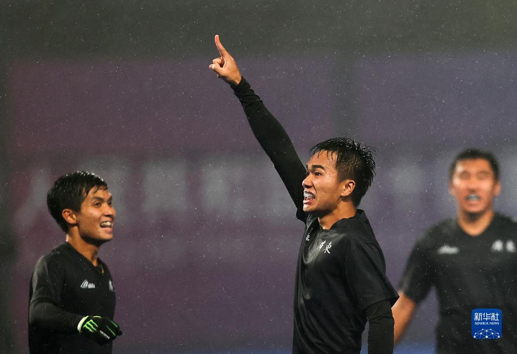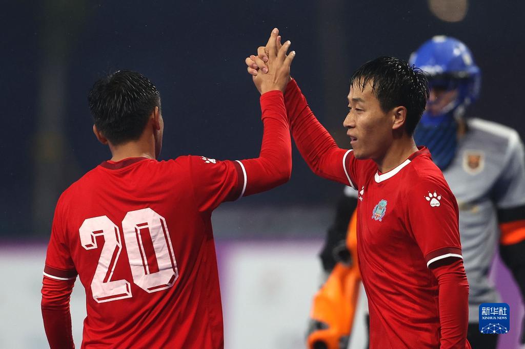 9月25日,广东队球员阮镇武(中)在比赛中庆祝进球。