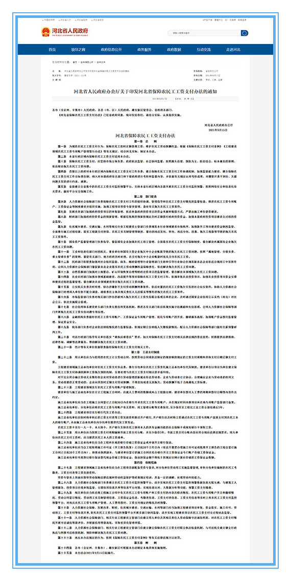 中工网讯 据河北省人民政府网站消息,9月15日,河北省人民政府办公厅出台《河北省保障农民工工资支付办法》(下文简称《办法》)规范农民工工资支付行为,保障农民工按时足额获得工资,维护农民工劳动报酬权益。