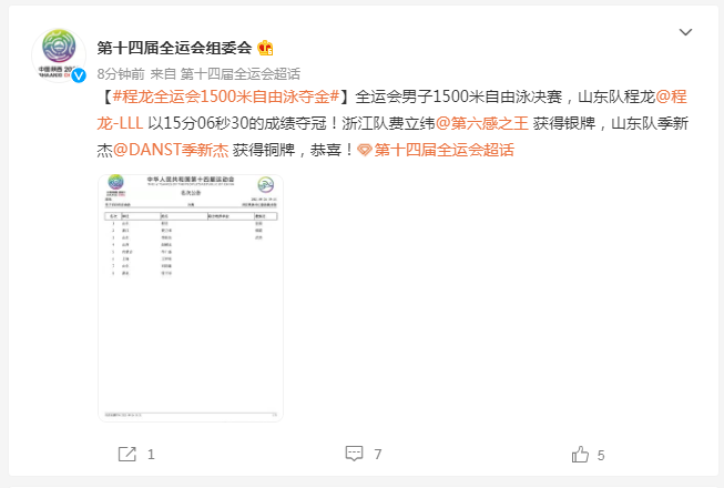 中工网讯 据第十四届全运会组委会官微消息,全运会男子1500米自由泳决赛,山东队程龙以15分06秒30的成绩夺冠!浙江队费立纬获得银牌,山东队季新杰获得铜牌。