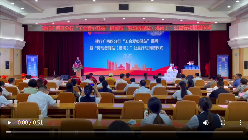 9月24日,以“工会搭台,公益聚力,共建劳动者港湾”为主题的中国建设银行广西壮族自治区分行“工会爱心驿站”揭牌暨“劳动者驿站(港湾)”公益行动捐赠仪式在南宁举行。