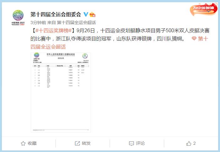 中工网讯 据第十四届全运会组委会官方微博消息,9月26日,十四运会皮划艇静水项目男子500米双人皮艇决赛的比赛中,浙江队夺得该项目的冠军,山东队获得银牌,四川队摘铜。