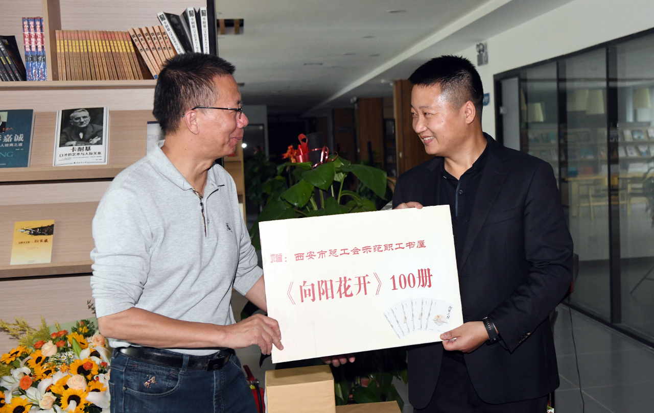 李亚军说:“《向阳花开》这本书是我的第一部散文,我发现文学更有魅力,能让人感受和撷取生活的诗意。我的文字是自然、真实甚至有些是滚烫的,我希望将这种生活气和温度送给普通的读者。另外,我相信生活还有一个诗意的底色,让我们一起致敬生活,感谢生活的真、生活的美和生后的善。”分享会上,李亚军向西安市总工会示范职工书屋赠送书籍《向阳花开》100本。